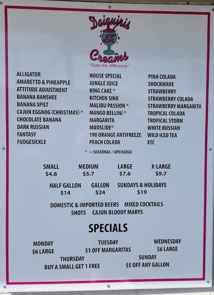 Welcome to Daiquiris & Creams, the delightful haven located at 1701 Lake Ave, Metairie, LA. This vibrant spot specializes in crafting an extensive range of delicious daiquiris, from the classic Strawberry to the adventurous Alligator and the festive King Cake. Each drink bursts with flavor, making each sip an indulgent experience.